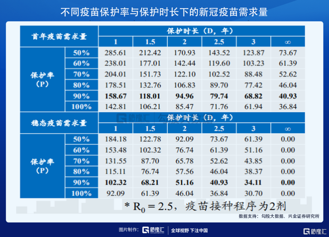 如果疫苗保护时长为1年的话,则后续年限需要每年大约需要13亿剂。