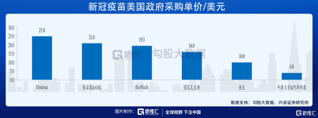 目前来看,新冠疫苗美国政府采购价,病毒载体疫苗采购价最低,基本不超过10美元/剂;mRNA疫苗采购价相对较高,约在20美元/剂左右;而重组亚单位疫苗采购价格介于二者之间。预计发展中国家采购价略低于美国政府采购价。