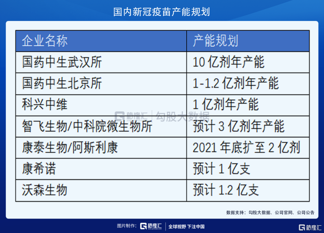国内来看,目前已披露产能规划的企业有国药集团、科兴中维、智飞生物、康泰生物、康希诺等,2021年预计产能总计19亿剂左右,预计在未来1年将处于紧平衡的状态。