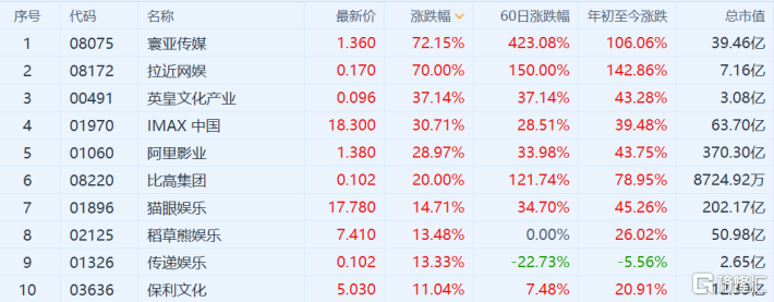 今早开盘后,寰亚传媒一度大涨逾140%,IMAX中国一度大涨逾88%。截至发稿,华亚传媒涨幅收窄至72%、IMAX中国涨幅收窄至30%、阿里影业震荡走高涨近29%、猫眼娱乐涨近15%。