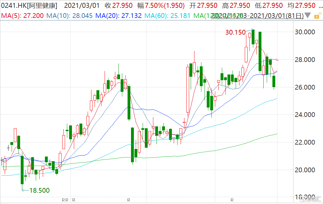 阿里健康(0241.HK)高开7.5% 获纳入恒生指数