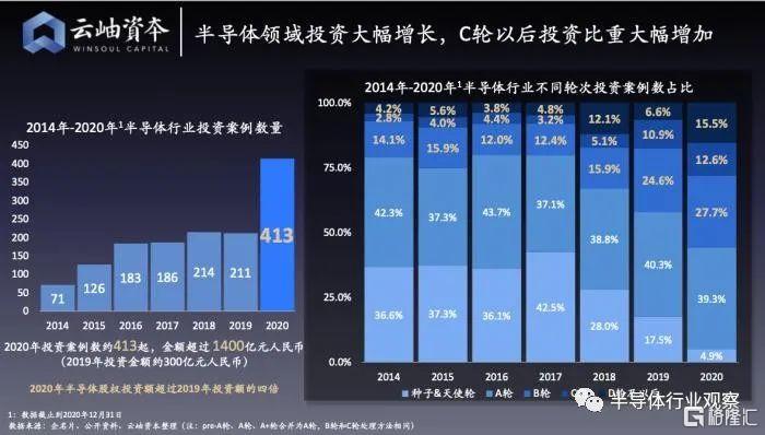 云岫资本赵占祥在今年一月份的一个演讲中也表示,根据其团队的统计,2020年半导体行业股权投资案例413起,投资金额超过1400亿元人民币,相比2019年约300亿人民币的投资额,增长近4倍,这也是中国半导体一级市场有史以来投资额最多的一年。这也推动了国内芯片公司的蓬勃发展。