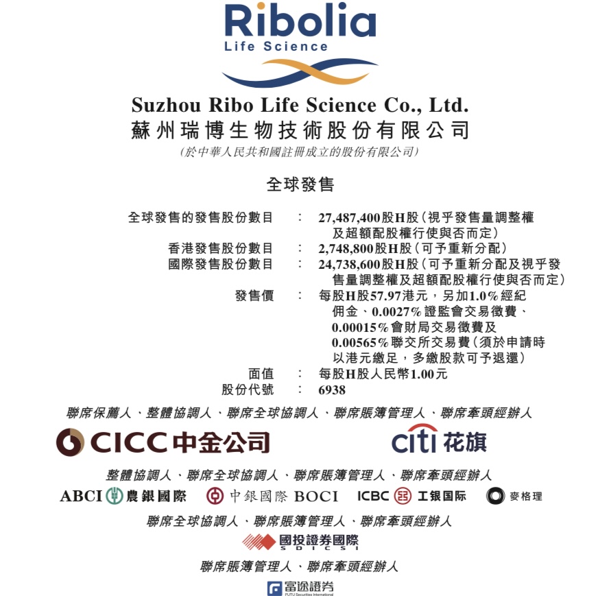 招股檔披露,瑞博生物於2023年、2024年收入分別約44,000元、142,627千元(人民幣),同期淨虧損約437,296千元、281,492千元;截至2025年6月30日止六個月收入約103,813千元、淨虧損約97,765千元。按發售價57.97港元計,假設不行使超額配股權,公司預計募資淨額約1,473.6百萬港元,資金擬用於核心產品RBD4059的研發(約37.4%)、RBD5044的研發(約19.6%)、RBD1016的研發(約15.9%)、臨床前申報階段管線資產的研發(約10.1%)、臨床前資產開發及技術平台加強(約8.9%)以及營運資金及其他一般公司用途(約8.1%)。