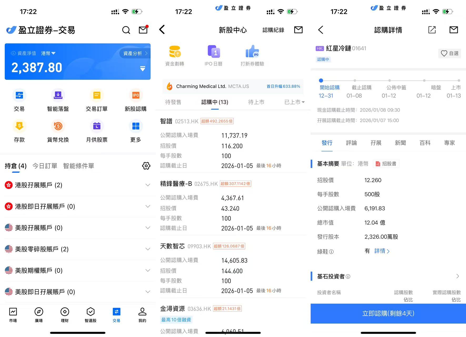 uSMART HK App 設有 IPO 中心,提供獨家優惠,客戶可在 App 即時認購公開發售之新股。登入 uSMART HK App 後,點選右下角「交易」,進入「新股認購」,選擇BBSB/紅星冷鏈/兆易創新後點擊「公開認購」,填寫認購數量並提交訂單即可。