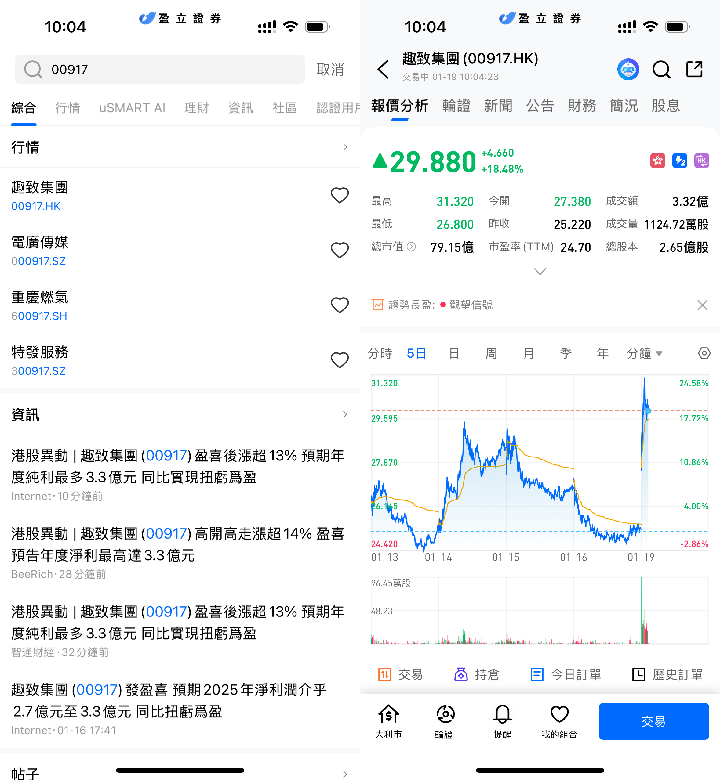 登入 uSMART HK APP 後,於頁面最右上方點擊「搜索」,輸入標的代碼(00917.HK)並進入詳情頁,瞭解交易詳情與歷史走勢。點擊右下角「交易」,選擇交易類型,最後填寫交易條件後送出訂單即可。