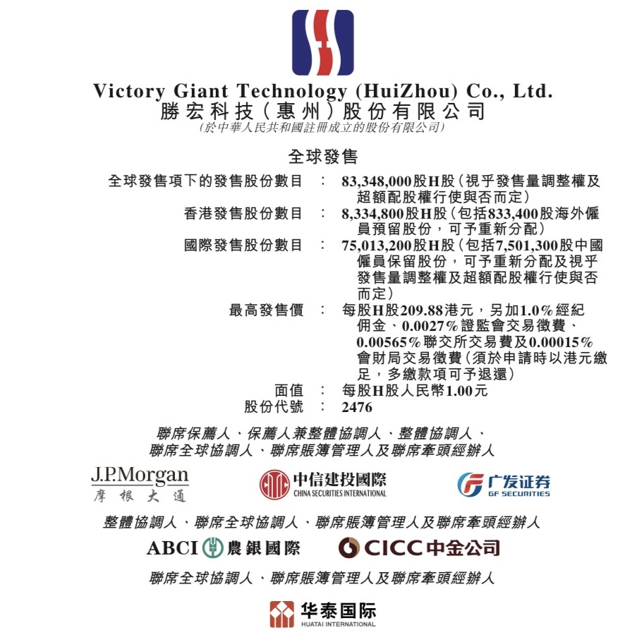 勝宏科技(惠州)股份有限公司(Victory Giant Technology (HuiZhou) Co., Ltd., 02476.HK)啟動香港IPO,招股期為2026年4月13日至4月16日,擬全球發售83,348,000股H股,並設15%超額配股權及發售量調整權;每股最高發售價209.88港元,每手100股,入場費約21,199.67港元;預期4月21日於聯交所主板掛牌,摩根大通、中信建投國際、廣發融資(香港)為聯席保薦人。