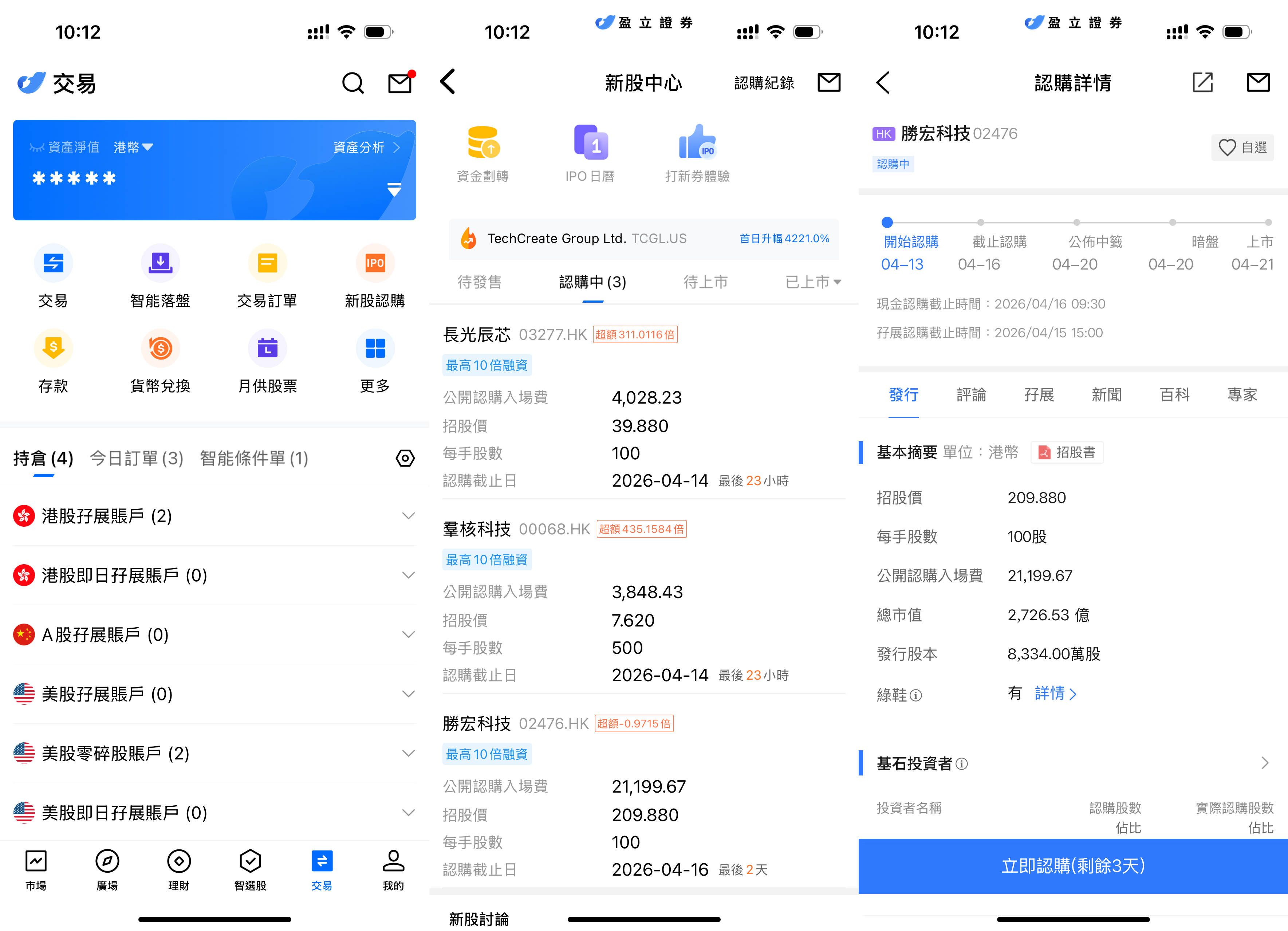uSMART HK App 設有 IPO 中心,提供獨家優惠,客戶可在 App 即時認購公開發售之新股。登入 uSMART HK App 後,點選右下角「交易」,進入「新股認購」,選擇勝宏科技後點擊「公開認購」,填寫認購數量並提交訂單即可。