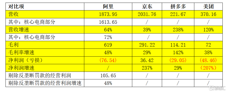 首先,相比去年一季度,不管是实体电商的阿里、京东、拼多多,还是服务电商的美团,业绩的增速都非常高,也大幅高于2019年同期的增速,这是中国经济复苏、消费回暖的又一个例证,是整个电商行业的大利好。