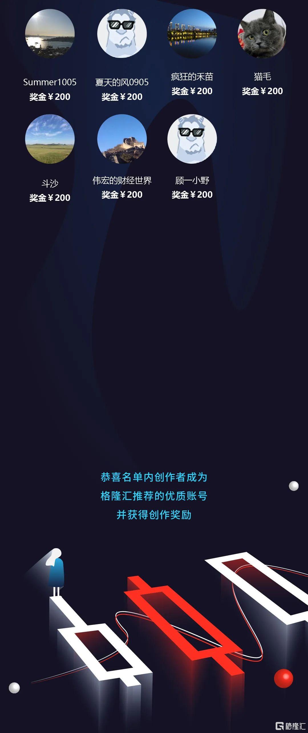 凡是参与《创作者计划》,并每月完成60篇100字简短图文股评,格隆汇必奖励保底200元现金,此外,格隆汇每月将选出《优质图文》创作者,每人奖励1000元奖金。