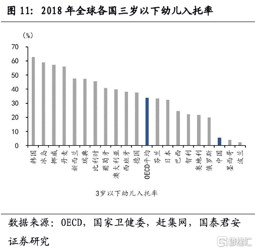 在中國,生育意願沒有有效轉化為實際生育,核心源於四類成本高企:1)女性生育機會成本,中國女性勞動參與率高,社會環境變化導致傳統儒家多子多福概念開始缺位;2)托幼成本,中國托幼機構數量奇缺,3歲以下兒童的入托率僅有5.5%,遠低於OECD國家35%的平均水平;3)教育成本,中國家庭“望子成龍,望女成鳳”的成本遠遠高於其他國家;4)住房成本,我們看到各地房價和出生率成反比,中國主要城市房價收入比在全球名列前茅。
