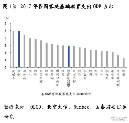 中國特色的教育觀念和模式,導致教育支出佔比非常之高。根據北京大學中國教育財政科學研究所發佈《2017年中國教育財政家庭調查結果》,2016 年下學期和 2017 年上學期,全國學前和基礎教育階段家庭教育支出總體規模約 19042.6 億,佔 2016 年 GDP 比重達 2.48%,而OECD國家的該數值普遍在0.5-1.0%區間。一方面是由於發達國家對教育的補貼力度高,減輕了家庭部門的教育壓力;另一方面是因為輔導班盛行,學前/小學/初中/普高階段的校外支出佔教育支出比例分別為11.2%/38.3%/32.5%/26.7%,很大程度上增加了的家庭部門的教育負擔,望子成龍,望女成鳳在中國所付出的成本是巨大的。