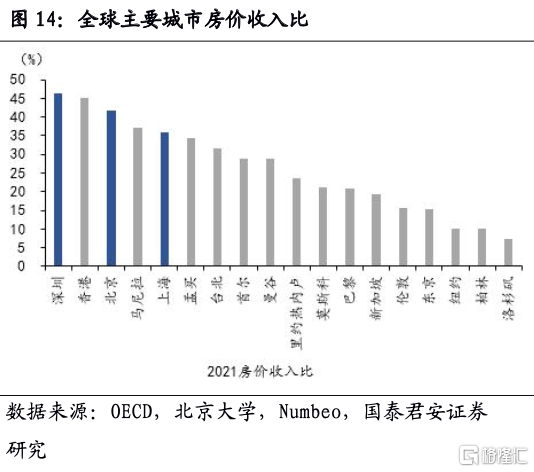 中國過高的房價也對生育產生負面作用。從各地方的數據來看,高房價和出生率呈負相關關係。目前中國的房價收入比位於全球前列,根據Numbeo數據,2021年深圳、北京、上海的房價收入比都在35以上,遠高於紐約、倫敦、東京等國際大都市。也就是説,一個普通人不吃不喝在深圳、北京需要工作40多年才能買得起一套普通大小的商品房。巨大的購房壓力無疑會對生育造成抑制。