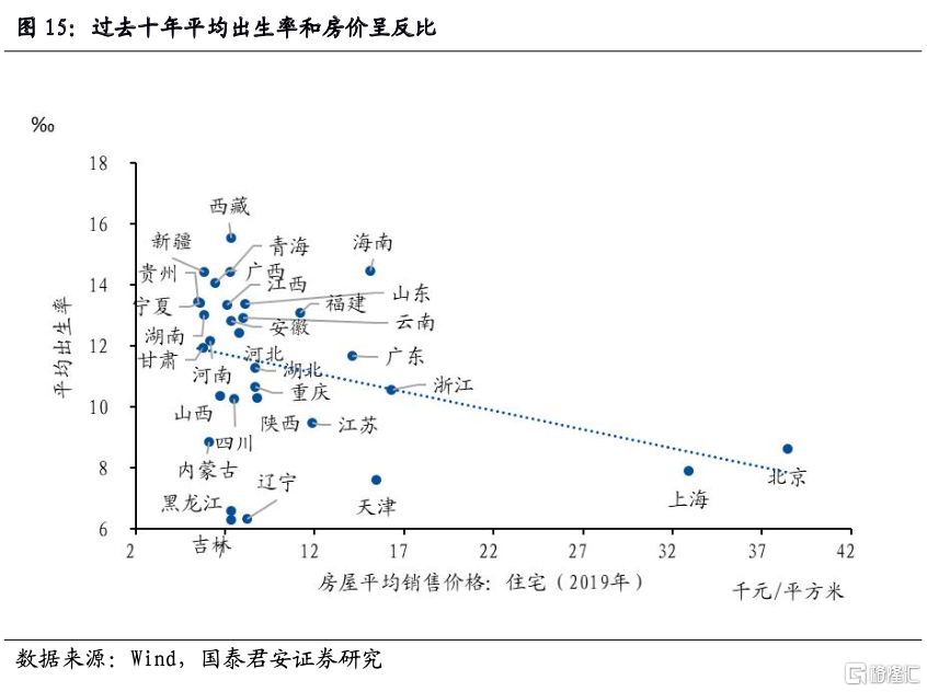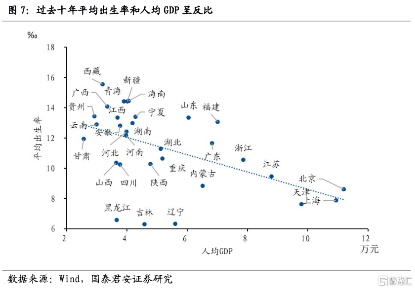 中國生育水平在不同省份之間分化較大,整體來看出生率和經濟發展水平成反比。具體來看,北京、上海、天津這三大直轄市區屬於典型的“經濟好、生得少”。這些區域雖然經濟好,但生活壓力大、制度成本高,居住人羣收入差距大,佔絕大多數的中等及偏低收入人羣生育情況受到牽制,最終呈現出經濟不錯,但生育疲弱的狀況。此外,顯著偏離趨勢線的還有東北地區和西藏、新疆等少數民族較多的地區,少數民族生育意願較強使得新疆、西藏等地的出生率偏高。