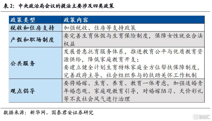 中央政治局會議提及四類生育支持政策,但沒有涉及現金補貼。我們梳理了會議上提及一些支持生育的舉措,基本都可以歸類到税收和住房支持、產假和職場制度、公共服務以及觀念倡導這四類中。唯獨在其他國家效果最好的現金補貼類政策出現了缺位,是目前最大的遺憾。