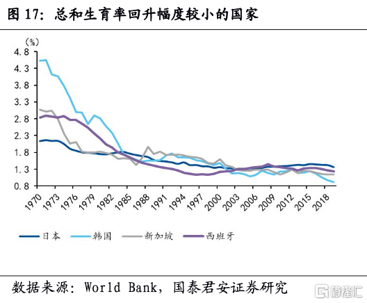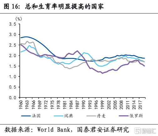 實施了生育支持政策的國家,總和生育率是否會有明顯提高還得看政策力度。其中在部分國家,總和生育率在政策的刺激下,從較低的水平提升超過0.5,主要有法國、瑞典、丹麥和俄羅斯。其他有部分國家,如韓國、日本、新加坡以及西班牙,實施了生育鼓勵政策後,總和生育率反彈的幅度可能只有0.2~0.3左右且並不穩定。