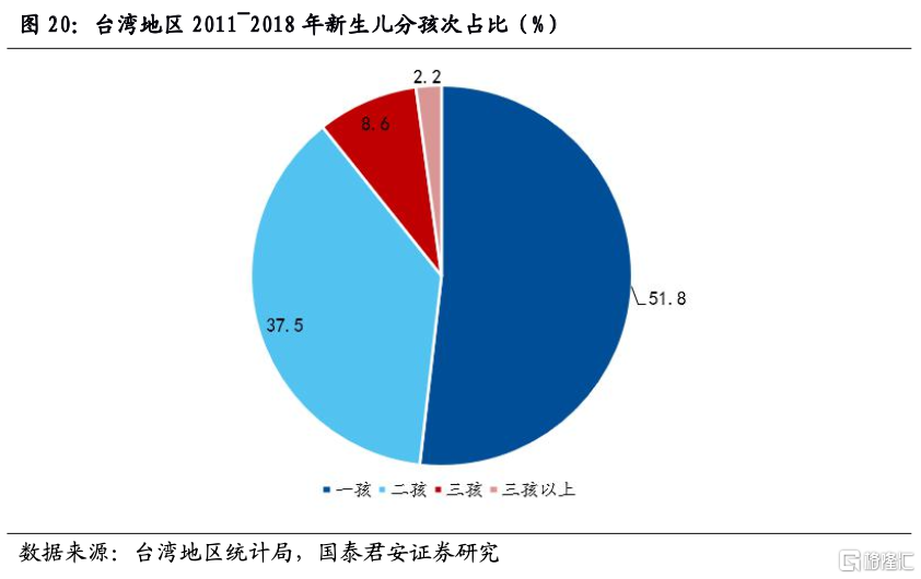 三孩的增量空間有多大?我們假定以中國台灣地區作為參照,中國台灣地區三孩佔出生人口約8.6%,若假設中國三孩出生率在政策放開後出現短期脈衝,然後逐漸穩定到與中國台灣地區接近的水平。近十年中國的三孩及以上出生佔總人口約為3.6%,還有5%的提升空間,參考2020年約1200萬的總出生人數計算,每年大約多出生三孩60萬人。在上文中,我們預測政策將帶來新生兒每年新增超過150萬人,那麼這其中三孩數量佔比或達到四成。我們這一計算過程的強假設是以中國台灣為參照,從人均收入的差距來看生育意願,我們覺得大概率三孩短期佔比難以完全複製中國台灣,因此數量最終難及四成。