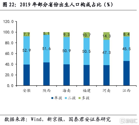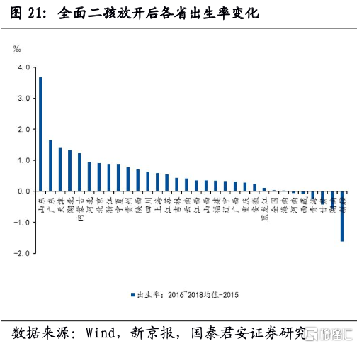 生育支持政策落地之後,沿海發達地區和少數民族聚集區的新增出生人口數量大概率較多。我們認為是否生育三孩主要取決於經濟能力和潛在生育意願,沿海地區經濟發展水平較高,而少數民族的生育意願相對較強。參考二孩全面放開時的情況(2016~2018年相比2015年),山東、廣東、天津、北京、浙江等沿海發達地區和內蒙古、寧夏等少數民族聚集區的生育情況有較明顯的改善。如果不考慮政策時點,歷史二孩佔本身就比較高的省份,比如説安徽、陝西、海南、福建也會有更多的機會。但是從增量角度,以及收入-成本角度考慮,我們覺得沿海發達地區和少數民族聚集地區的居民可能會更有生育三孩的意願。
