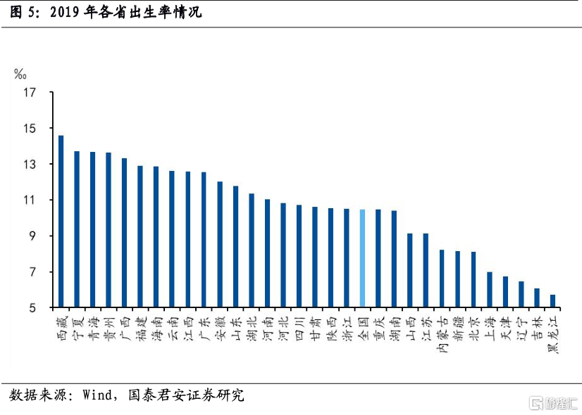 生育方面,第七次人口普查數據顯示2020年出生人口1200萬,創1963年以來新低,1.3的總和生育率創實施全面二孩以來新低,主要經濟體中僅略高於韓國。考慮到全面二孩放開後,有很多此前想生但不能生的人都集中在近幾年生育,導致當前二孩在新生兒中佔比偏高,實際的總和生育率水平還要低於1.3。我們通過2019年抽樣調查的出生率數據來分析各省的情況,可以看到全國平均出生率為10.48‰,最高的西藏地區達到了14.6‰,而最低的黑龍江地區僅為5.73‰,不同地域之間的出生率差異很大,生育的不均衡非常顯著。