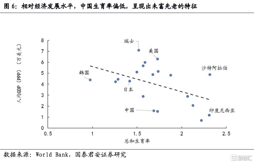 相對經濟發展水平而言,我國生育率明顯偏低,人口呈現未富先老的特徵。經濟發展就會讓人們享受到更加完善的社會福利和社會保障,使人們不必“養兒防老”,並且隨着婦女受教育水平提高,會將更多時間投入工作,因此生育意願也會相應變低。國際比較來看,人均GDP(購買力平價)衡量的經濟發展水平和總和生育率基本呈負相關。而我國位於整體趨勢線的左下方,説明相對經濟發展水平,我國生育率明顯偏低。人們的富裕程度還未達到標準,生育情況就先行走弱。