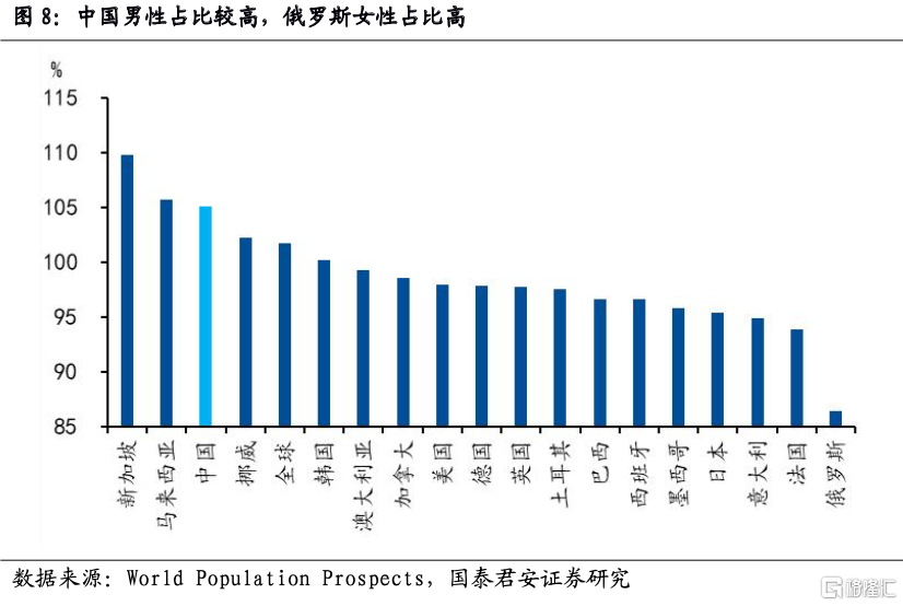中國男性在人口中的佔比偏高,從人口代際平衡角度,這對中國女性的生育率提出了更高要求。七普結果顯示,中國當前的男女性別比為105.07,較六普的105.20有一定下降,但在全球範圍內還是一個相對偏高的水平。由於總和生育率衡量的是每個婦女在育齡期間生育的子女數量,如果要達到同樣的人口總量目標,中國需要更高的總和生育率水平。舉個例子,世代更替生育率是指人口數量能夠長期維持穩定、每代人口數量相同的生育水平。如果不考慮未成年夭折,男女性別比為1的情況下,世代更替生育率就是2,即每位婦女生育2個孩子,就可以更替兩個人的死亡。但是中國由於男性佔比較高,每個婦女需要生育更多孩子,才能實現世代更替。
