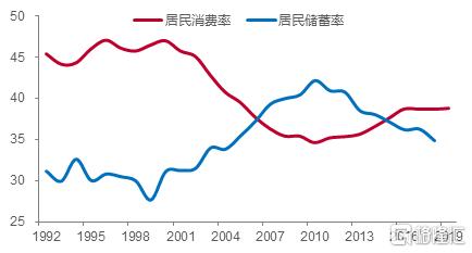 例如,把國民儲蓄率中的居民儲蓄率單列出來,發現居民儲蓄率的最低點是1999年,從1999年的27.63%上升到2010年的42.1%,增加了14.5個百分點。儘管到2018年我國的居民儲蓄率已經降至34.8%,但仍遠高於發達國家的普遍水平。據統計,在經合組織(OECD)國家中,2016年居民儲蓄率最高的三個國家分別為瑞士、瑞典和墨西哥,其數值分別為18.79%、16.02%、15.45%。相比之下,2016年我國居民儲蓄率高達36.1%。
