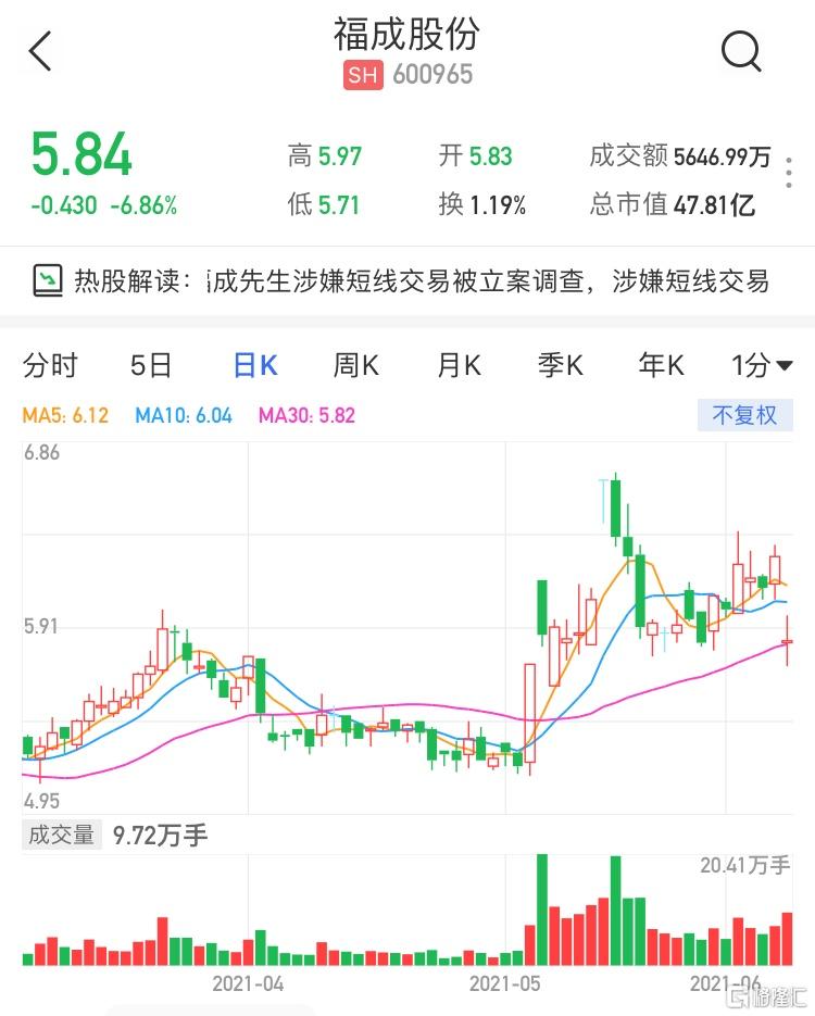 格隆汇6月8日丨福成股份(600965.SH)现报5.84元,跌6.86%,暂成交5646万元,最新市值47亿元。福成股份昨日晚间发公告称,实际控制人李福成先生涉嫌短线交易被立案调查,涉嫌短线交易具体认定数额,以中国证券监督管理委员会调查结果为准。