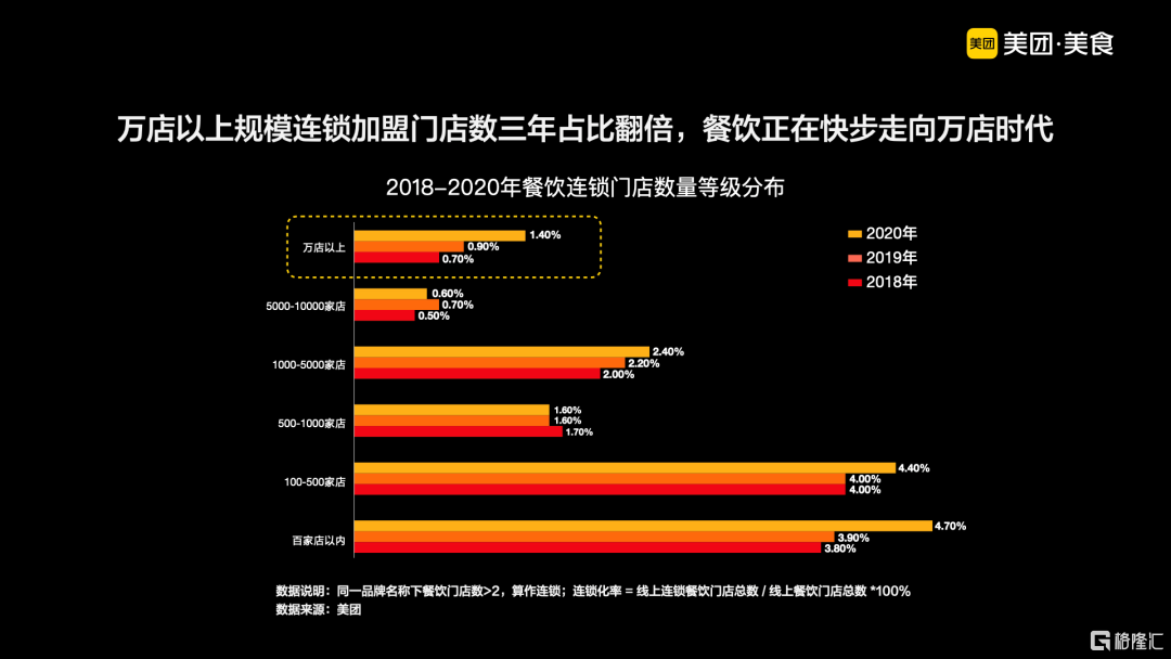 根據美團發佈的數據,目前,從連鎖品牌的不同門店數規模分佈來看,萬店以上規模的餐飲連鎖門店數佔比從2018年的0.7%增長至2020年的1.4%,僅三年時間佔比翻倍。