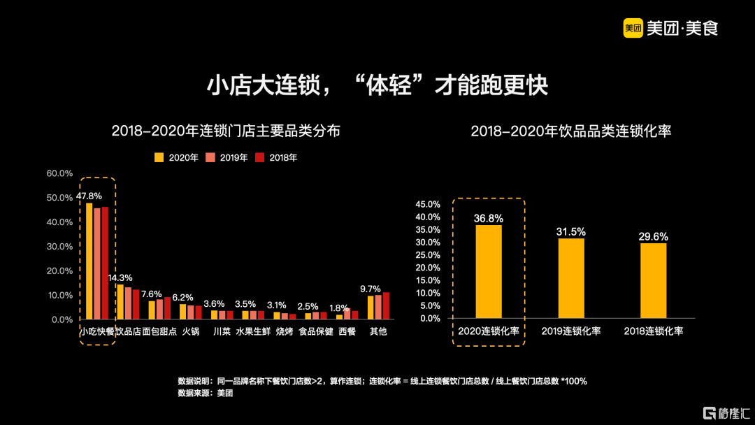 中國飲食口味多、製作環節多,往往容易造成單店天花板低、異地擴張難的困境。但近年來,在火鍋、炸雞、奶茶、鴨脖、麻辣燙等品類上,連鎖化的速度明顯提升,帶動中國餐飲連鎖化率從2018年的12.8%,提升到2020年年底的15%。