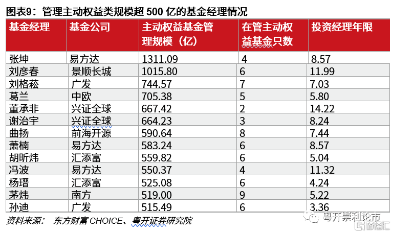 截至2021年5月14日,根據全部已披露完畢的2021年一季度基金定期報吿,市場上共有13位基金經理主動權益類基金(包括普通股票型、偏股混合型、靈活配置型、平衡混合型)管理規模超過500億元,其中有2位基金經理(張坤、劉彥春)的管理規模超過了1000億元,與2021年四季度末相比,劉彥春新晉成為另一位千億級別資管規模的的基金經理。