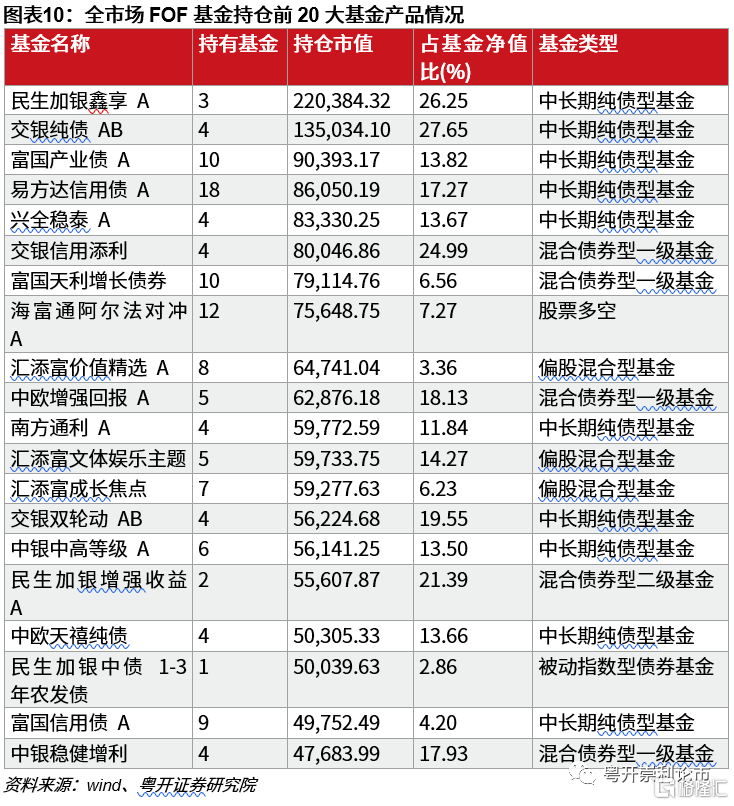 2021年一季度公募FOF基金持倉規模前20大的產品的持倉規模均超過了5億元,前20大入圍門檻逐季提升。民生加銀鑫享穩居第一,持倉規模達22.04億元,由民生加銀康寧穩健養老一年、民生加銀卓越配置6個月、民生加銀康寧平衡養老3只基金所持有的。分類來看,重倉規模前20產品多為債券型基金,只有4個非債券型基金產品,分別為海富通阿爾法對沖A、匯添富價值精選A、匯添富文體娛樂主題和匯添富成長焦點,其中後三隻基金主要由匯添富基金旗下FOF基金所內部持有。
