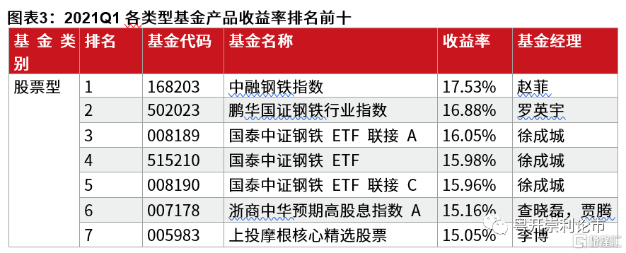 截至2021年5月14日,公募基金行業所有基金產品已完成2021年一季報相關數據信息披露。我們在統計過程中剔除了部分業績異常變動的基金,同時對同一基金經理旗下的相同底層資產、不同收費類型的A類、C類基金以及分級基金不同份額按照主代碼基金進行了合併統計。