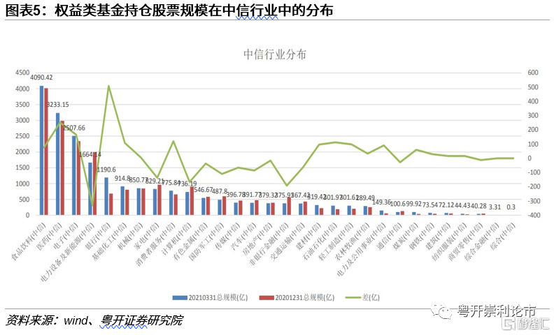 我們權益類基金相較於2020年四季度末,整體股票持倉規模降低約3650億元,其中90%以上減倉集中在製造業。2021年Q1公募基金倉位呈現出減配成長,增配防禦類的週期、消費風格的趨勢。分行業來看,電力設備及新能源行業減倉幅度最大達330億元,銀行加倉規模達536億元。