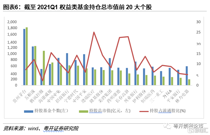 關於個股層面的持倉情況,我們統計了權益類基金持倉市值最大的20大重倉股,排名榜首的貴州茅台已突破千億規模。其中食品飲料行業的4支股票中,有3只是白酒股票,剩餘1只為伊利股份,白酒股份持有比例明顯擴大,貴州茅台仍然是基金一致認為的優質核心資產;隨着新冠疫苗需求的不斷增長和國家“健康中國”的戰略導向,以邁瑞醫療、恆瑞醫藥為代表的醫療生物行業股票也成為了權益類基金的主要配置標的。