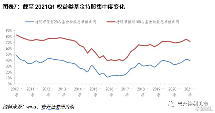 一季度權益類基金前10大和前100大股票的集中度分別達到39.49%和71.47%,仍處於近八年高位。持股集中度的高位回調反映出即便在一季度股票市場經歷震盪的背景下,公募基金資金抱團的趨勢仍然十分顯著。同時也表明在全球範圍內疫情對經濟的影響尚根本性消解的情況下,只有經營業績保持相對穩定且持續向好的投資標的,才能得到機構投資者的青睞。從縱向歷史分位來看,2021年一季度權益類基金的持股集中度的歷史分位數達到了56.52%,側面證實了公募基金抱團持股的現象依舊持續,市場震盪格局下基金經理們的持股集中度偏好並未大幅轉向,只是發生了階段性的結構調整