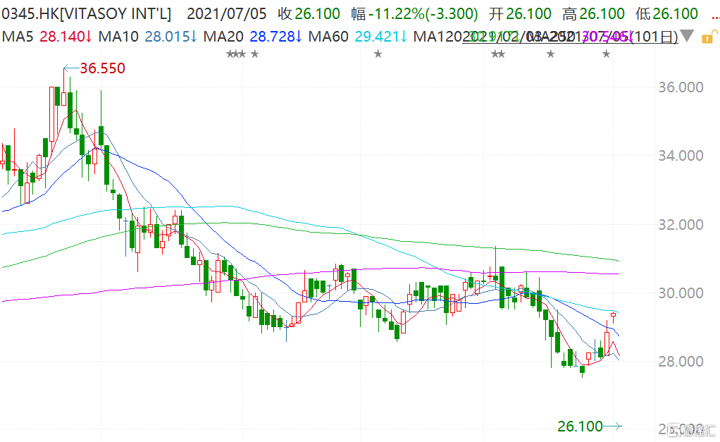格隆匯7月5日丨維他奶(0345.HK)跳空低開11.22%報26.1港元,股價創去年9月以來新低,市值279億港元。維他奶集團因慰問襲警員工,多位明星代言人宣佈與其終止合作,且全國多地商戶紛紛下架其產品。