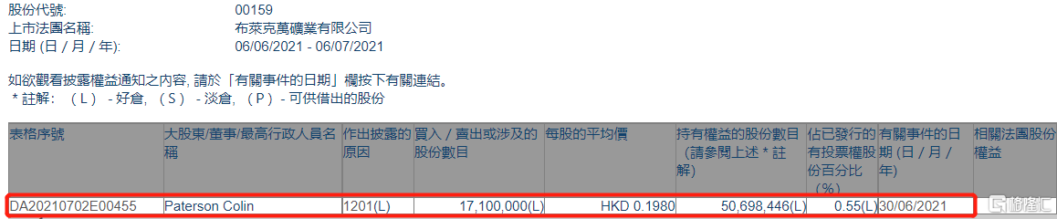 格隆匯APP獲悉,根據聯交所最新權益披露資料顯示,2021年6月30日,布萊克萬礦業(00159.HK)遭Paterson Colin在場外以每股均價0.198港元減持1710萬股,涉資約338.58萬港元。