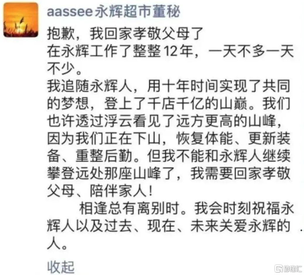 2021年7月7日凌晨,永輝超市一連發出多則公告,內容分別涉及董祕離職、聘任新董祕、終止股權激勵以及回購股份用於註銷。同一時間,永輝超市離職董祕張經儀發佈了一條朋友圈稱,其在永輝工作已整整12年,要回家孝敬父母了。