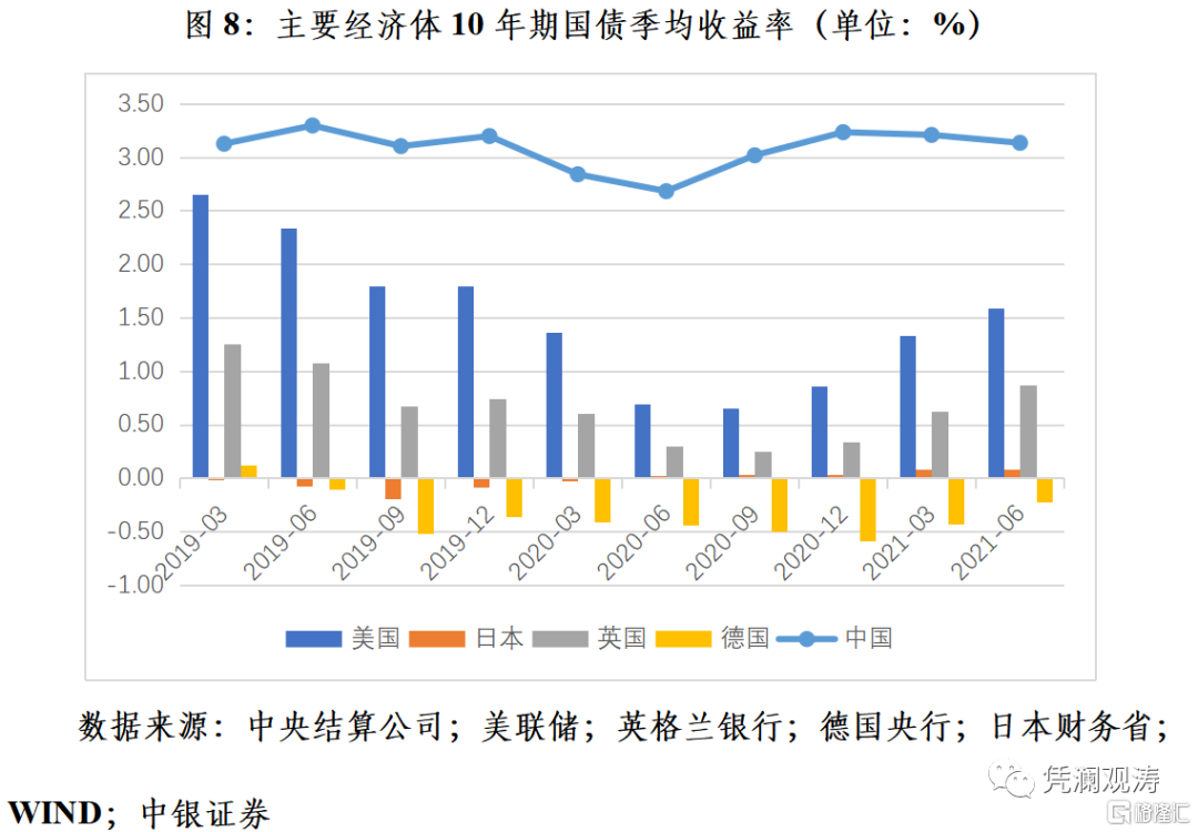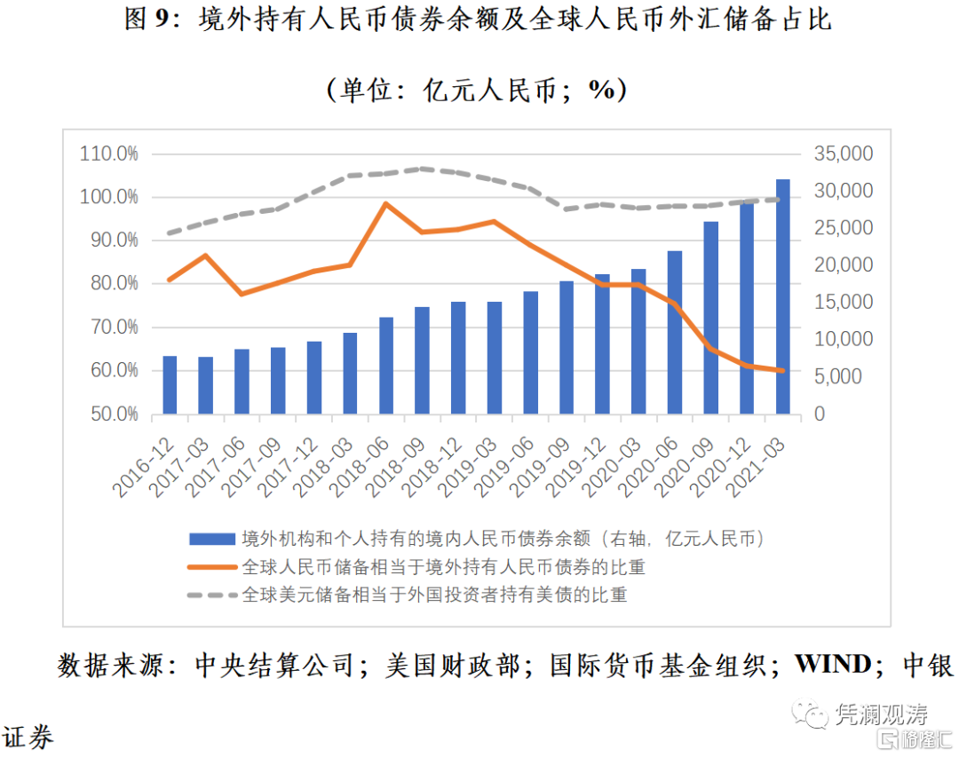 2008年金融危機以來,主要經濟體普遍實施非常規貨幣政策。去年應對全球公共衞生危機,貨幣刺激進一步加碼,全球零收益、負收益債券盛行,全球安全資產稀缺。而中國始終珍惜正常貨幣政策空間,保持了人民幣資產的正收益(見圖8)。加之近年來中國債券市場對外開放的體制機制安排不斷與國際接軌,人民幣債券先後被納入三大國際債券指數,這增加了人民幣債券資產的國際吸引力。