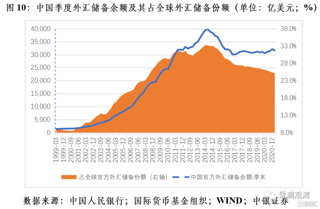 所謂“美元陷阱”是指,當儲備貨幣超發時,外匯儲備既是國際貨幣體系不穩定的來源,也會成為外匯儲備持有者的負擔,使其陷入兩難困境,即:不拋售儲備資產,有可能面臨儲備資產縮水的風險;拋售儲備資產,又可能加快儲備資產縮水,減少儲備資產積累,還會加速本幣匯率升值。2008年危機爆發後,中國以增加外匯儲備的方式阻止人民幣過快升值,2009年初至2010年底,中國新增外匯儲備9013億美元。而這次危機,中國央行基本退出外匯常態干預,在無限量寬實施一年來,中國僅新增外匯儲備1094億美元。截至今年一季度末,中國外匯儲備佔全球外匯儲備(含未披露幣種構成的外匯儲備)份額為25.2%,較2014年一季度末峯值低了8.1個百分點(見圖10)。