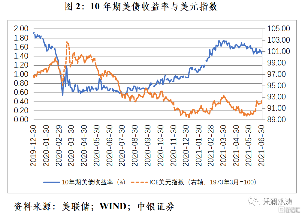 截至今年一季度末,在全球已披露幣種構成的外匯儲備餘額中,美元儲備餘額較上季末減少52億美元。上次美元儲備減少發生在2019年三四季度,分別下降了246億和41億美元。去年3月份雖因新冠疫情衝擊、市場避險情緒驟升,出現了階段性減持美債的情況,但一季度全球美元儲備持有不降反增452億美元(見圖4)。這是因為,一方面去年一季度僅3月份外國投資者淨減持美債,前兩個月連續淨增持,當季外國投資者仍淨增持美債1053億美元;另一方面,當時市場拋售美債後,也是逃向了美元流動性。