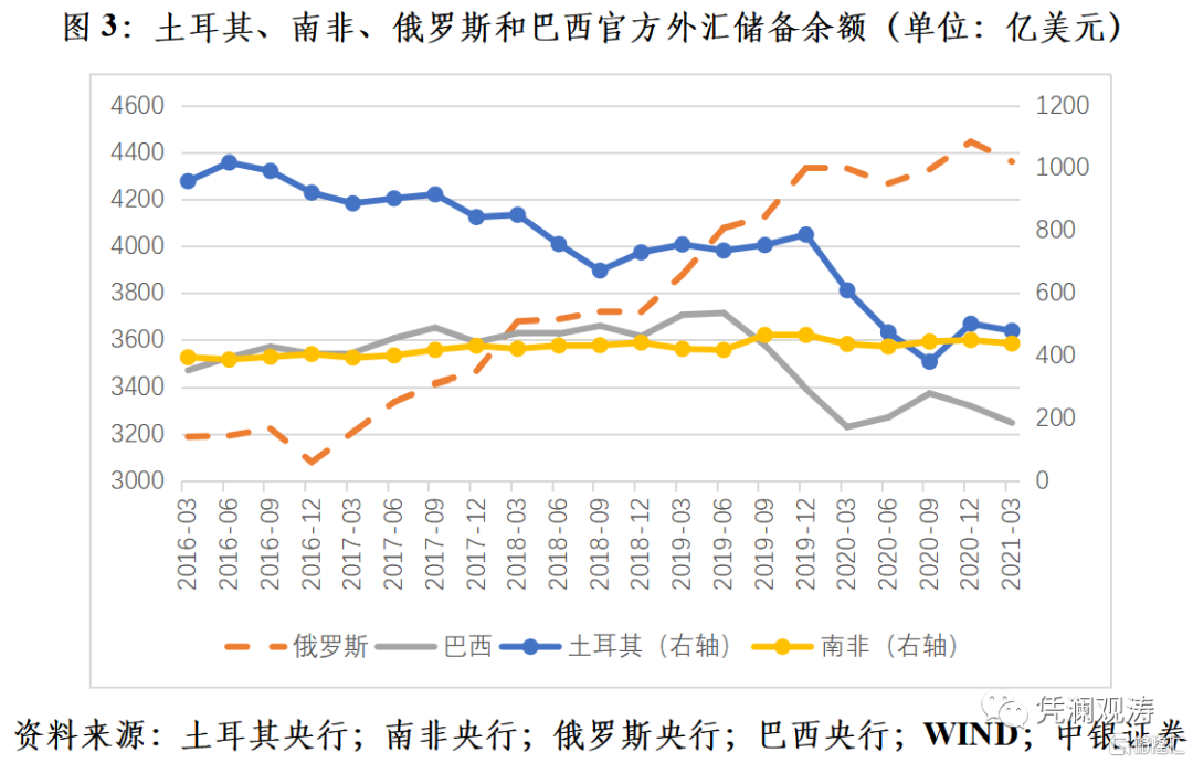 三是部分新興市場發生“縮減恐慌”。當季,土耳其、南非、俄羅斯和巴西外匯儲備合計減少了191億美元,貢獻了同期已披露幣種構成的外匯儲備降幅的15%(見圖3)。