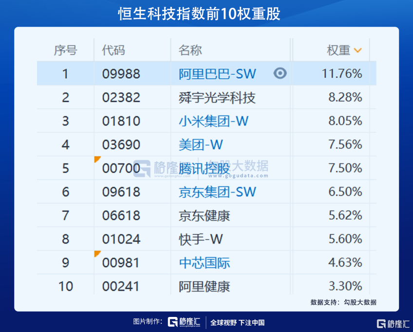 恆生科技指數的30個成分股中,數量上互聯網公司佔到60%,權重佔到68%,前十大權重中,互聯網公司佔了8席,可以說,恆生科技指數等同於中國的互聯網上市公司指數。