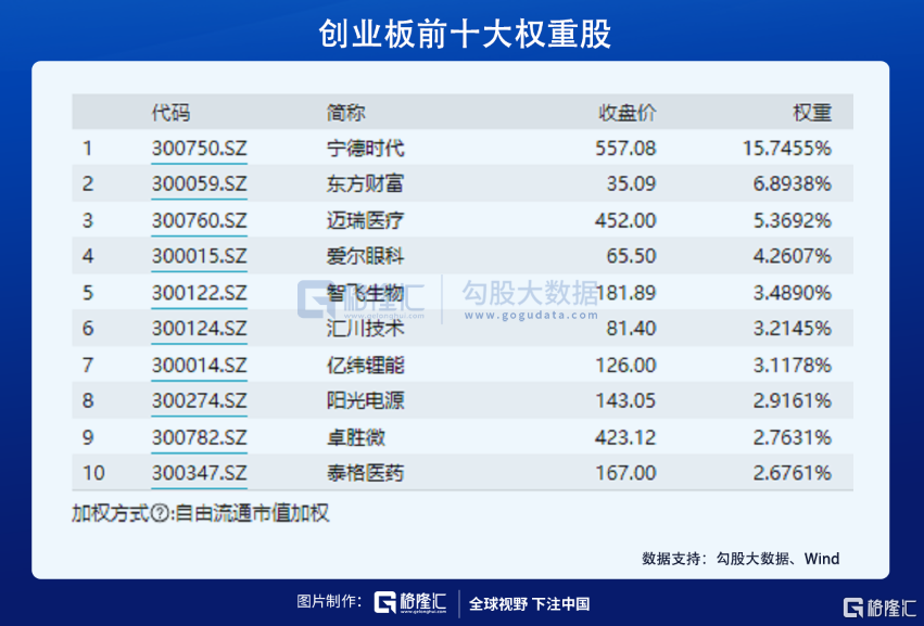 而創業板指數的100家成分股,歸屬互聯網傳媒的公司只有4家,屬於製造業的一共72家,前10大權重中,有7家屬於高科技術製造業。