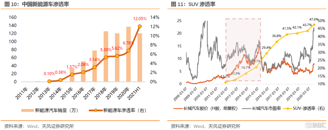 行業空間方面:根據IEA純電動+插電混動口徑,截止2020年中國新能源車滲透率為5.7%,歐洲也僅10%。以國內統計口徑,截止2021H1,新能源車滲透率達為12%。結合目前的政策趨勢、銷售情況以及參考10年代初SUV市場,當前新能源車仍在快速滲透的前期,產業鏈業績進入兑現階段,中期維度看板塊大概率將繼續享受估值溢價,直到出現滲透率提升放緩的跡象。