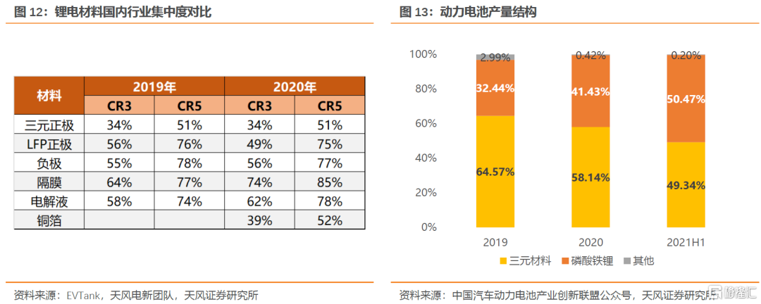 正極材料:電芯四大材料中成本佔比最高,當前集中度相對較低。兩條主流的技術路線對比來看,三元材料正極優點在於能量密度高、續航能力強;LFP磷酸鐵鋰正極優點在於材料成本低廉,安全性強。由於補貼退坡的影響(以及一定程度上受自燃事故影響),19年至今碳酸鐵鋰電池產量比重有所提升。但高續航里程和智能駕駛的需求下(以及下游相對強的溢價能力),正極材料趨勢為三元正極高鎳化、一體化,未來行業整合速度有望加快。