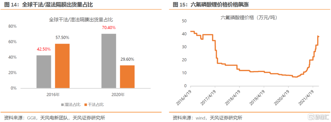 電解液:產能集中度較高、且目前已經基本實現國產化,四大材料中週期性最強品種。主要材料六氟磷酸鋰價格17年之後經歷3年半的下跌,去年9月由低點6.95萬元/噸漲到目前38萬元/噸,漲幅超400%。此外,VC等添加劑缺口也在進一步擴大。