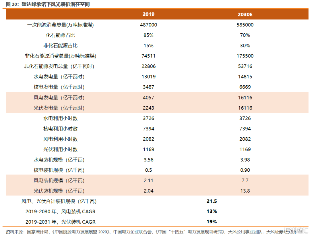 風光裝機空間:國家電網在《中國能源電力發展展望2020》報吿中測算,在常規轉型情景和電氣化加速情境下,一次能源需求有望在“十六五”前期達峯,峯值約為58億~59億噸標準煤。此外,2060年非化石能源佔一次能源的比重將達到63%~81%左右。按照天風公用事業團隊測算,假定2030年一次能源消費總量58.5億噸標準煤,非化石能源佔比由2019年15%逐年提升1.4%至2060年72%。則預計到2030年,風電、光伏發電量分別由2019年0.4/0.2萬億度提升至1.6/ 1.6萬億度;裝機容量分別由2019年2.1/2.0億千瓦提升至7.7/13.8億千瓦,合計21.5億千瓦,高於2020年12月氣候雄心峯會上提出的12億千瓦最低目標。2019-2030年風光裝機CARG分別為13%、19%。