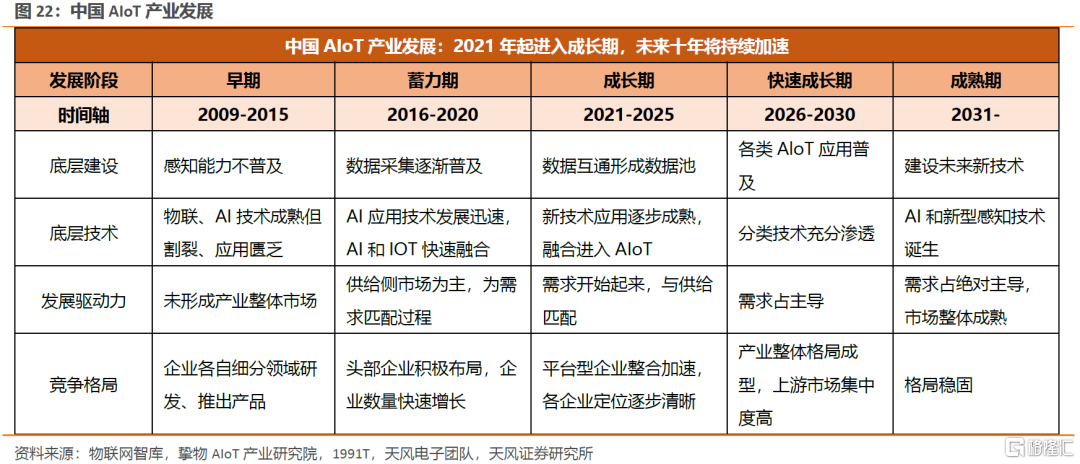 AIoT產業鏈可分為四個層級:感知層包含傳感器、芯片等的底層元器件;網絡層包含通信技術與服務商,主要是作為數據的傳輸者;平台層主要是對數據進行存儲與分析;下游應用層實現專用化的AI功能和服務。