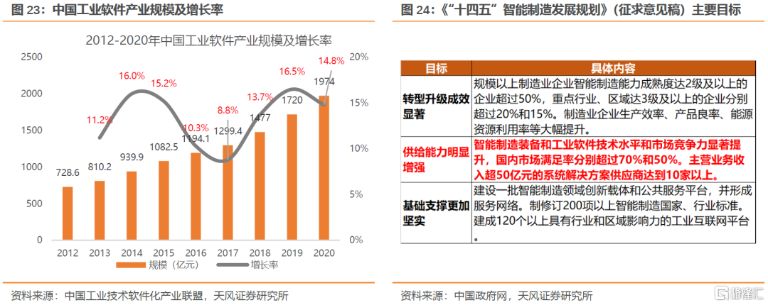 主要驅動力來自國產替代:《“十四五”智能製造發展規劃(徵求意見稿)》明確提出2025實現工業軟件國內滿足率超過50%。目前各環節來看,ERP國產化率整體較高,但高端ERP國產化率也只有25%左右;MES產品國產化率為30%;核心的CAX國產化率最低,目前僅為11%左右。