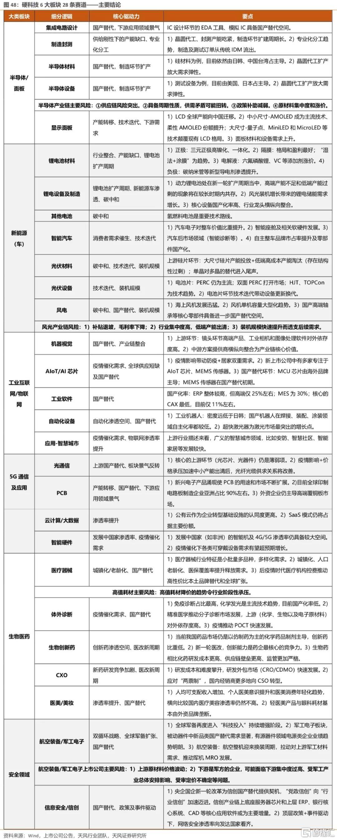 我們精讀19年以來上市的創業板/科創板公司財報(50億以上市值,共214家),梳理了上市公司對各自所在產業鏈的描述。整體來看,當前硬科技具備五重驅動力:1)國產替代/產能缺口2)能源革命/低碳環保3)滲透率提升/技術革新4)國防安全/信息安全5)消費升級/老齡化結合上市公司財報描述及行業團隊推薦,我們篩選出六大產業鏈當中目前景氣度較為明確的28個方向。